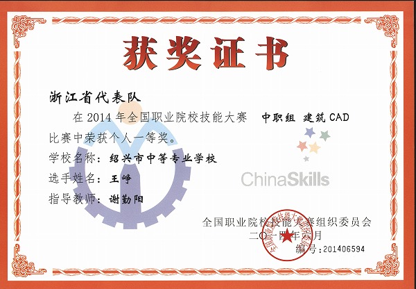 王峥同学荣获2014年全国职业院校技能大赛中职组建筑CAD比赛项目一等奖