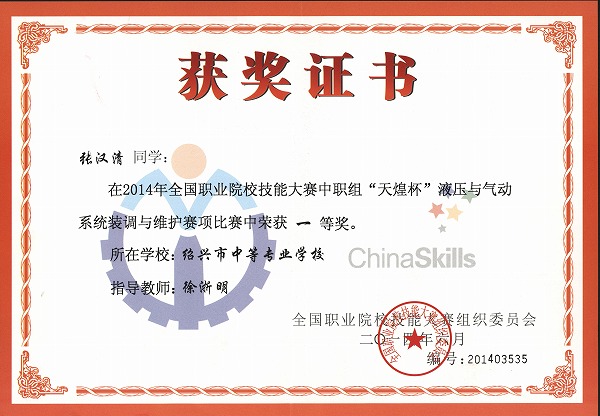 张汉清同学荣获2014年全国职业院校技能大赛中职组液压与气动系统装调与维护比赛项目一等奖