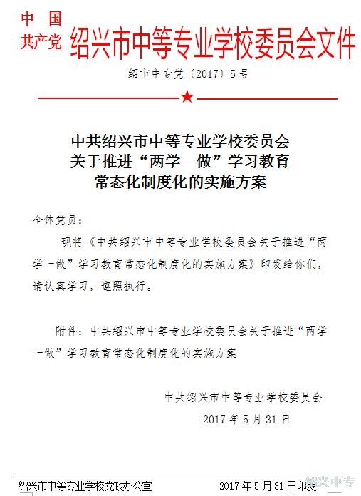 中共绍兴市中等专业学校委员会关于印发《关于推进“两学一做”学习教育常态化制度化的实施方案》的通知