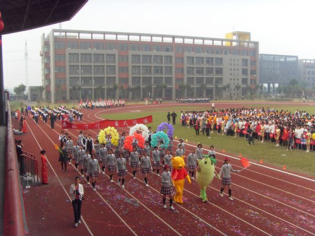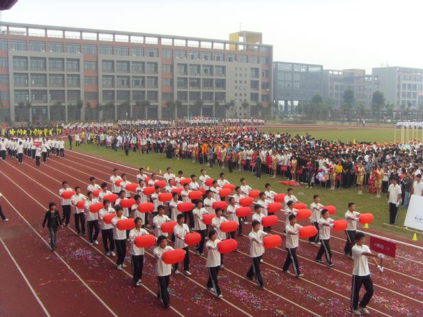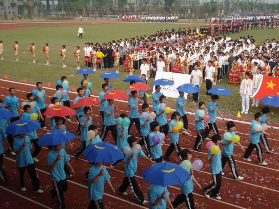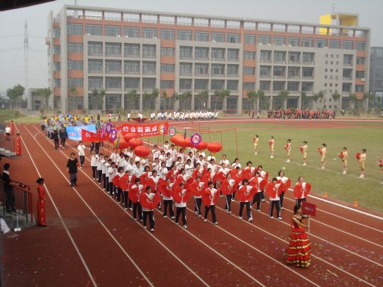 在嘹亮欢快的运动员进行曲中,分别走过了财电学区、建工学区、外语学区、化工学区和机电学区。他们正以整齐的步伐,军人的风采展现必胜的信心。他们精神激昂,口号响亮,预示运动会定会圆满成功。