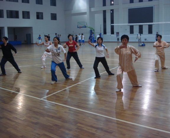 如果有心的你在一天的傍晚走进宏伟的体育馆,便会惊讶的看到一群翩然的身影,平日中穿梭在教室之间、学生之间,耕耘在课堂中,辛勤在讲台上的老师们身着飘逸宽松的练功服,随着音乐捭阖自如,俨然是个个武林中人。