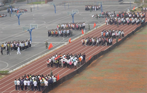 军训第一天 来源:信息中心 作者: 发布时间:2015-11-25 浏览次数: 次 【字体:小 大】 5月5日,是09届预科新生军训第一天,中专球场上,操场上荡漾着新生们铿锵有力的口号声,展示着刻苦坚强的英姿。 一大早,娄校长、卢书记、冯校长、王校长,都早早的在教学楼、操场上、广场上、球场上巡视了,随着集中的“号角”,各预科班学区长、班主任、教官们带领着各自的队伍,开始了为期一周的军训历程。