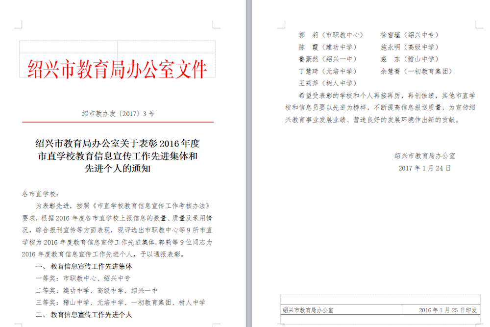 2016年,在办公室牵头下,通过全校教职工,特别是各处室、系信息员的努力,学校在绍兴晚报、绍兴教育网、浙江职成教网、绍兴工会网等媒体报道达157篇,在校园网发布学校新闻350余篇,有效推广了学校的办学成果,提升了学校的知名度与美誉度。出色的工作得到了市教育局的充分肯定,在2016年度的教育信息宣传考核中,学校获得教育信息宣传工作一等奖,学校被评为2016年度教育信息宣传工作先进集体,徐雪瑾老师被评为教育信息宣传先进个人。
