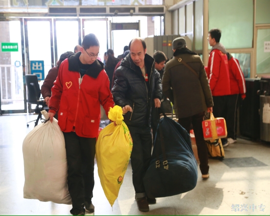 旅客朋友:大包小包的行李是您一年辛苦劳动的收获,里面可能装着带给孩子的新衣服、玩具和年货,这是您回家最重要的东西吧,请让中专的娃帮您搬运一下!
