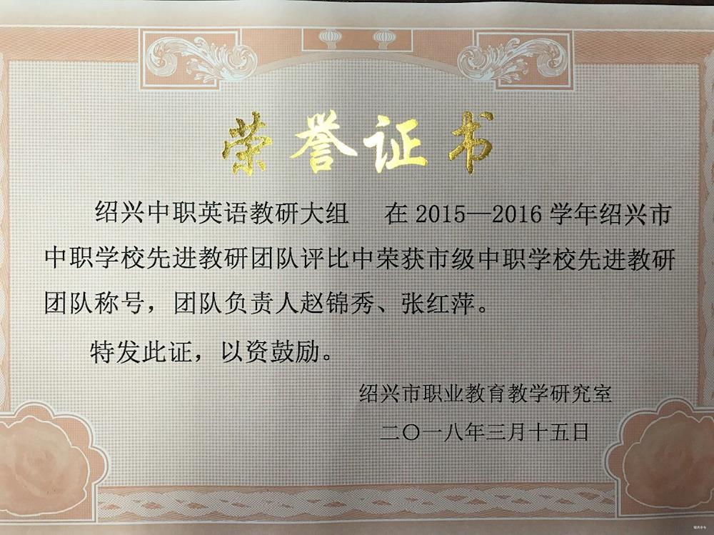 长期以来,绍兴市中职英语教研大组关注全市英语学科的发展,团结协作,齐力推进英语教学与英语教师的发展,去年底还被评为“2015—2016学年市级中职学校先进教研团队”。希望在市中职英语教研大组的继续推进下,中职英语学科的发展能够在2018年稳步前进、绽放光彩。